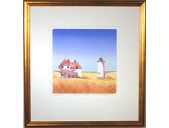 The historic Race Point Lighthouse, located near Provincetown at the northern tip of Cape Cod, was named for strong cross-currents known as 'races' -- once a nightmare for merchant sailors. In Richard Harrington's monotype, Race Point takes on a dreamy quality, its simplicity of line set off by soft purple shadows, tawny ochre sea grass and a perfect Cape Cod sky. Race Point Light is a refreshingly uncluttered monotype measuring 20"(h) x 19"(w) in a gold wood frame under glass.