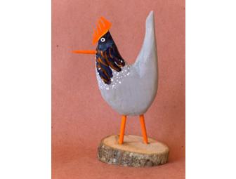 Chick-Flick heartthrob Dewie Pile will ruffle your feathers with laughter as he flaunts his puffy orange crown and charms you into changing to a vegetarian diet. Rob Mariani's hand- carved, hand-painted wood chicken measures 7"(h) x 5"(w) x3"(d).