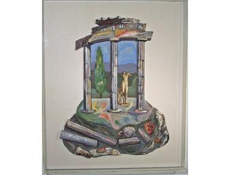 The classically famous Greek sculpture, Venus, is enshrined in Tuscan ruins in this fascinating mixed media collage by renowned artist Marilyn Pappas. With the transcendent female figure of Venus radiantly beautiful in contrast to the crumbling archeological artifacts and underpinnings, the piece celebrates the goddess and the feminine principle.