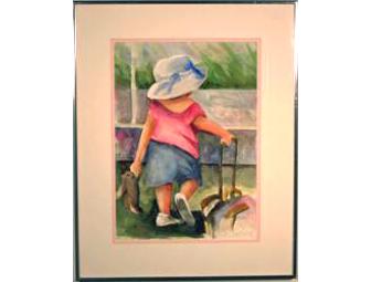 With her teddy in one hand, and her princess jammies tucked in a pint-sized suitcase in the other, she's Going to Grandma's for a special overnight. Ben Macomber's precious little tyke is wearing her favorite grown-up hat as she toddles to Grammy's in this irresistible watercolor measuring 20"(h) x 16"(w) in a silver metal frame under glass.