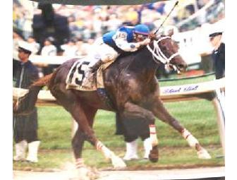 This is a hand signed color 8x10 photograph of Smarty Jones signed by jockey Stewart Elliott. This photograph was taken at the Kentucky Derby and is professionally framed and matted in a black wood frame. Smarty gained national acclaim in 2004 while pursuing the Triple Crown -- horse racings greatest accomplishment.
