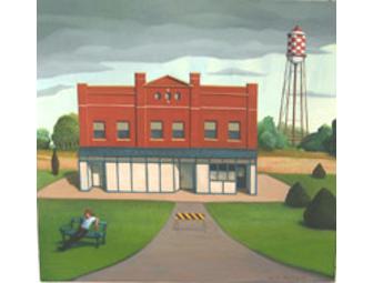 A Remembrance of Things Past. Going Out of Business depicts a once-thriving mill, architecturally lovely even in its ill-fated idleness. For Penelope Manzella, "Mills and other industrial buildings of the past occupy a haunting presence in today's landscape. For years I have followed roads leading to them, drawn there by the bold, elegant chimney stacks that punctuate the skyline." When I start to paint them, "I often place them in imaginary landscapes... I work to make the painting interesting -- to evoke an emotional response -- to stir a memory."