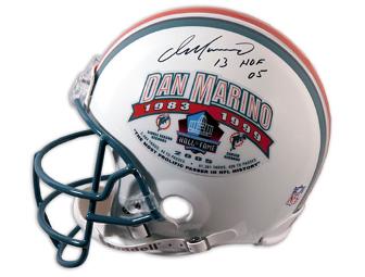 Dan Marino is one of the greatest quarterbacks of all time. Commemorate his induction into the hall of fame with this limited edition (Riddell Pro-Line helmet. The helmet comes with the Dolphins logo on one side and the HOF logo on the other side with some of Marino's career accomplishments. The helmet is hand signed by Dan Marino with the inscription HOF 2005. A certificate of authenticity is included.