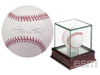 This official Major League Baseball is hand signed by Willie Mays. Included with this item is a glass case with a cherry wood base. Item includes a Certificate of Authenticity.