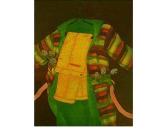 With depth, intensity and vibrant clarity, Rain Coat radiates exuberant color hues characteristic of the aquatint etchings printmaker Dan Allison pioneered in the 80's, colors which continue to light up the fashion scene today. This luminous ltd ed (18/37) aquatint measures 28"(h) x22"(w) in a black wood frame under glass (image size: 22" x 17").