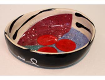 This stoneware bowl measures 3"(h) x 9"(w) x 8"(d). It delights the eye, uplifts the spirit and is sure to please the palate of its lucky owner.
