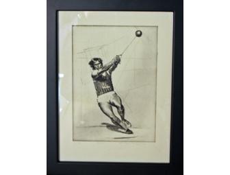 A dynamic image and especially inviting etching of a hammer thrower pre-flight, Whirling Projection invites the eye to linger in anticipation. Ian Goudreau's signed limited edition (1/5) etching measures 14"(h) x 11"(w) in a black wood frame under glass.