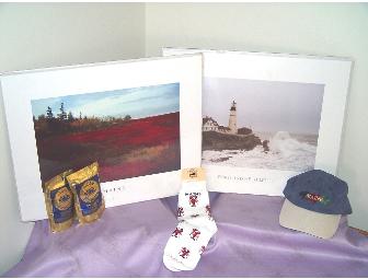 Warm up mothah or your sweetheart with this Mainah Gift Set. Picture your sweetie pullin' on a pair of lobstah socks, wearin' they-ah authentic Maine ball cap, and munchin' on TWO packages of Gourmet chocolate-covered Maine blueberries. TV on the fritz? Enjoy these two Maine prints, "Blueberry Barrens" and "Portland Headlight," by Martin Shuer from Windham, Maine. Sure beats that velvet paintin' o' Elvis that your sistah made in grade school.