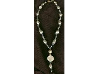 What woman wouldn't want to be seen in this eye catching, one-of-a-kind necklace? The piece was handmade by emerging local designer Cynthia Winston-Ford and features Mother of Pearl nuggets spaced with natural quartz crystals, swarovski crystals and freshwater pearls.