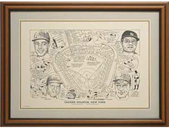 Great cartoon collage of Joltin' Joe DiMaggio, Mickey Mantle, Babe Ruth, Lou Gehrig and Yankee Stadium. Many great moments from Yankee Stadium shown in this cartoon such as Don Larsen's Perfect Game in the 1956 World Series, Lou Gehrig's Farewell Speech, Roger Maris' 61st Homerun, Mickey Mantle's 500th Homerun, and Joe DiMaggio's 56 Game - Hitting Streak.