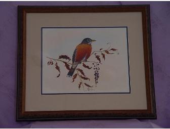Original painting of a brown-breasted robin perched on a berry-laden tree, and by artist J. H. Czech. This delightful painting of one of spring's favorite songsters dates from 1980, and is from the estate of R. Rockefeller. It is approx. 18"x16" in a brown marbled-wood frame.
