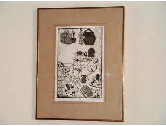Framed black and white woodblock picture from E.M. Bellman. "Gourmet Delight" is a cozy kitchen scene complete with a well-stocked table, trays of cookies, hanging garlic and baskets stacked with fall fruit! Approx. 12x16" with "tasteful" beige and white matting, this picture is sure to inspire the cook, the gourmand and guests alike! From the estate of R. Rockefeller.