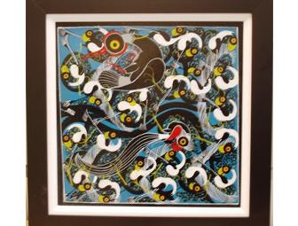 "Blue Birds" - Original Tinga Tinga Painting from Tanzania, East Africa. 23" x 23" in black frame.