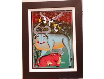 "Cape Buffalo" - Original Tinga Tinga Painting from Tanzania, East Africa. 17.5 x 11.5 in black frame.
