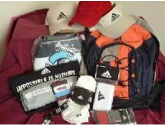 This great backpack is filled with two t-shirts, two baseball caps, one visor, wrist bands, frisbee, keychain, sport socks, and a wallet.