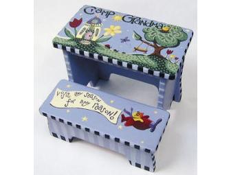 Hand painted with a whimsical design. Top reads "Camp Grandma". The bottom step reads "visit any season for any reason". Light assembly required. 12"Hx14"Wx13"D.