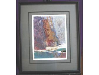 Contemporary abstract print. Professionally matted and framed. Grey mat and black wood frame. 21"W x 25"H.