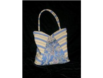 This lovely 11" x 12" tapestry wedgewood blue and saffron handbag will look lovely on your favorite lady's arm.