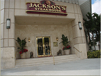 Dinner for two at Jackson's Steakhouse. Jackson's Steakhouse, located adjacent to the heart of downtown Fort Lauderdale on sophisticated Las Olas Boulevard, carries on the tradition of the great American steakhouses. Jackson's is reminiscent in style of a private men's club with its rich mahogany paneling, high-beamed ceilings, brass trim, marble accents and warm fabrics. The spectacular setting befits the classic steakhouse menu. The world-class food and the restaurant's interior magnificence is matched only by its warm, caring, professional service. "Professionals serving professionals" is the motto at Jackson's with a commitment to "exceeding everyone's expectations every time".