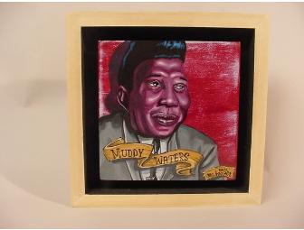 Legendary blues man, Muddy Waters, is depicted in this acrylic on wood painting. Painting measures 7" square and is mounted in a shadowbox-style frame measuring 10" x 10".
