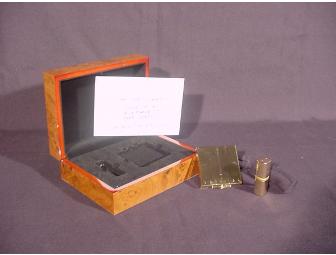 Own your own gold compact and lipstick nestled in a laquered wood box. With this is a gift certificate for 25% off your purchase of merchandise to the new Lucent Cosmetics-Jeni Lee Cosmetics in the Deerfield Mall.