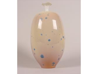 A decorative accent to any decor, this handcrafted porcelain vase is varying shades of tan depending on the point of focus. Trimmed with steel blue accents in varying shapes, it has the artist's mark on the bottom.