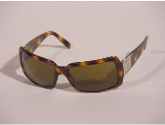 Bvlgari Tortoise Shell Sunglasses. Olive green wrap around lenses measure 1 1/2 by 2 1/2 inches and fit snugly to your face to protect you from the sun's rays. The distinctive logo is prominent on the temples. Completing the item is a leather case and a cleaning cloth.