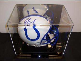 Payton Manning, starting Quarter back for the Indianapolis Colts has personally autographed this full size helmet. Helmet comes displayed in this beautiful acrylic case with a black acrylic base and gold risers. Certificate of authenticity included. Winning bidder must pay $15.00 UPS ground shipping and handling.