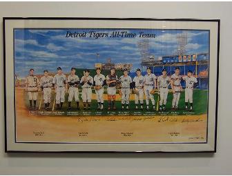 This lithograph takes you through time starting with Bennette Park, Navin Field, Briggs Stadium all the way to Tiger Stadium. The fields are the back drop for the players such as Ty Cobb, Charlie Gehringer, Hank Greenberg, Hal Newhouser. The next players have all autographed the litho including George Kell, Bill Freehan, Mickey Lolich, John Hiller, Jack Morris, Alan Trammell, Kirk Gibson and Sparky Anderson. This litho measures 40" x 25". What a wonderful piece to add to anyones collection of Baseball memorabilia. Litho comes with certificate of authenticity. Winning bidder must pay $15.00 UPS Ground shipping and handling.