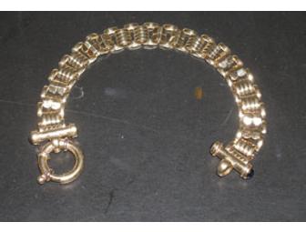 A 14k gold Italian designer bracelet set with four cabochon sapphires on the toggles. Generously donated by Emile and Mindy Zafrany of Simon & Co. Jewelers in Kingston.