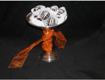 A sterling silver pedestal candy dish with one pound of delectable dark chocolate truffles. Linda Casey and Cathy Reppert are the donors of this item.
