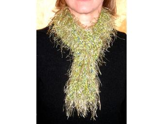 A sparkling green, lightweight scarf for wearing practically all year round. Crocheted with an interesting twist of multiple yarns. Made with nylon, acrylic and polyester yarns. 54 inches long by 4 inches wide. Made by Liz Hibbard Ortega, Wyoming Seminary's director of alumni and parent programs.