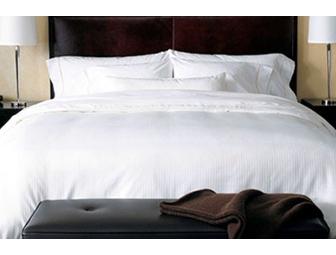 Fall into heavenly slumber while wrapped in the finest of linens. This queen-sized Heavenly Bed Ensemble includes a custom-designed Simmons mattress and box-spring, a silk-touch polyester bed skirt with a 15" drop, 100% Egyptian cotton flat and fitted sheets (thread count 230), a down blanket, a duvet with cover, and five pillows and pillow cases. Embrace the swirl of luxury and comfort by making the Heavenly Bed your oasis.