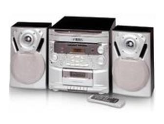 Emerson 6 Disc Home Audio System - Home audio system- Features AM/FM stereo- 6 CD changer- and cassette recorder/changer- Bass boost control- Stereo wide control - Electronic volume control- Stereo headphone jack- Includes 2 4" wide range dynamic speakers- Includes 21 key remote control with CD operations- Unit dimensions: 12.6"W x 12.6"H x 15.4"D- Speaker dimensions: 7.9"W x 12.6"H x 6.3"D- Black with silver trim AM/FM STEREO FEATURES:- Receiver features large sliding rule tuning dial- LED FM stereo indicator- Built-in AM- external FM antennas6 CD CHANGER FEATURES:- Motorized- drawer loading 6 CD carousel changer with unique double-decker design- 32 Track programmable memory- Backlit LCD (displays track number- program number- playing time- disc number- play- random- pause- repeat- and program indicators)- Direct one-touch selection of all six discs- Skip track and high-speed music search functions- 4-Way repeat playback (one track- one disc- all discs- program repeat)- Random playback- Intro scan playback CASSETTE RECORDER/PLAYER FEATURES- Records directly from radio or CD changer- Automatic recording volume level control- Automatic end of tape shut off- Pause control for simplified tape editing