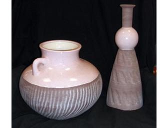 Two hand-thrown ceramic vases from Vietnam. The vase on the left measures 10 inches high and 10 inches in diameter.