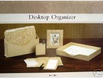 Organizer includes six file folders and eleven lables, pencil holder, frame for 4 by 6 photo, notepad, coordinating file box and paper tray.