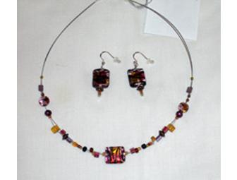 Unique and colorful glass bead jewelry, hand crafted by local artist Laura Slocum. The drop earrings are sterling silver. The necklace is approximately 16 inches.