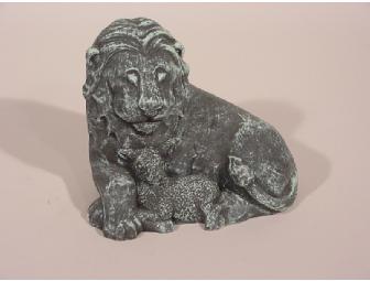 This beautiful cast plaster rendering of the biblical story of the lion and lamb will grace any home or office. The overall size of the statue is 8 inches high, 9 inches wide and about 6 inches deep. It is finished in deep grey-green hue resembling aged outdoor statuary.