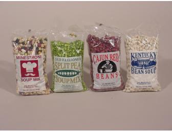 Enjoy great winter comfort food with this Five Star Gourmet Cooking set from the S.S. Bean Company. The box contains four packages, each with its own recipe. There is a 10.5 ounce package of Cajun Red Beans, a 10.5 ounce package of Kentucky Bean Soup, a 12 ounce package of Split Pea soup mix, and a 10.5 ounce package of Minestroni soup mix. A perfect addition to your pantry!