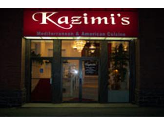 A $75 gift certificate to Kazimi's Restaurant in Kingston: Mediterannean and American Cuisine.