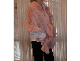 A sheared rabbit knit cape with two pockets. One size fits all.