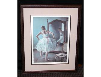 A numbered (338/350) and signed lithograph by Russomanno. Ornate mahogany frame soft mesa pink mat and ornate mahogany fillet. Outside dimensions are 27 by 33 inches.