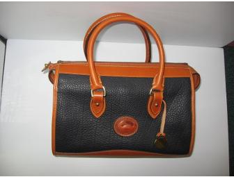 Carry your essentials in style with this classic navy and brown Dooney and Bourke purse.