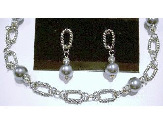Gorgeous necklace with matching earrings. The necklace is similar to the David Yurman Tahitian Grey Pearl and Diamond Necklace. Grey Pearls with Enhancers on a Silver Figaro Chain. Length is adjustable from 17" to 19". Matching Pierced Drop Style Earrings.