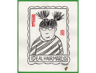 This is an original art piece from Lynda Barry called "Ideal Hair Marlys." It is hand-ground Chinese ink on acid-free paper, sized about 8x10" with hand carved stamps in red.