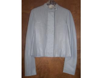 Calvin Klein Women's short jacket with trapunto stitching on front. 100% lamb leather. Color is Blue Smoke. Size is 8. Made in Italy.