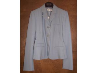 Calvin Klein short princess fitted jacket in summer weight wool. Darts in front. Three buttons. 100% wool. Color is spa blue. Size 4. Made in Italy.