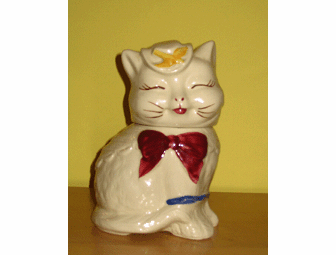1945-1947 Vintage "Shawnee Puss N Boots" Cookie Jar makers mark on bottom of jar. This Cookie Jar is in fantastic shape with no rim chips, cracks or cold paint misses. This incredible piece stands about 11" tall weighing 3.75lbs. Don't miss this great opportunity for you and your family to enjoy this authentic piece of American Art Pottery.