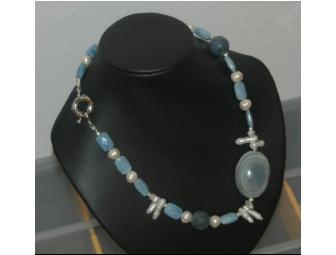 Personally designed by Sonia Ancoli-Israel, this one of a kind necklace is made of chalcedony (blue-lace quartz), blue coral and pearl with large quartz center piece and a silver clasp.
