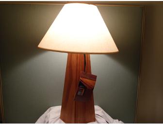 A beautiful lamp with a base constructed of Lyptus wood with a parchment shade. Designed by Bill Hustin this wood, much like cherry, darkens with age to a warm reddish-brown. 25"Hx16"Wx 16"D.